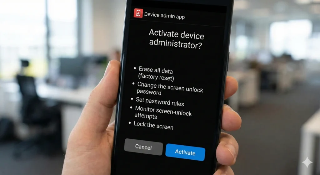 Granting Device Admin rights gives an app near-total control.3 Most apps have zero reason to ask for this.